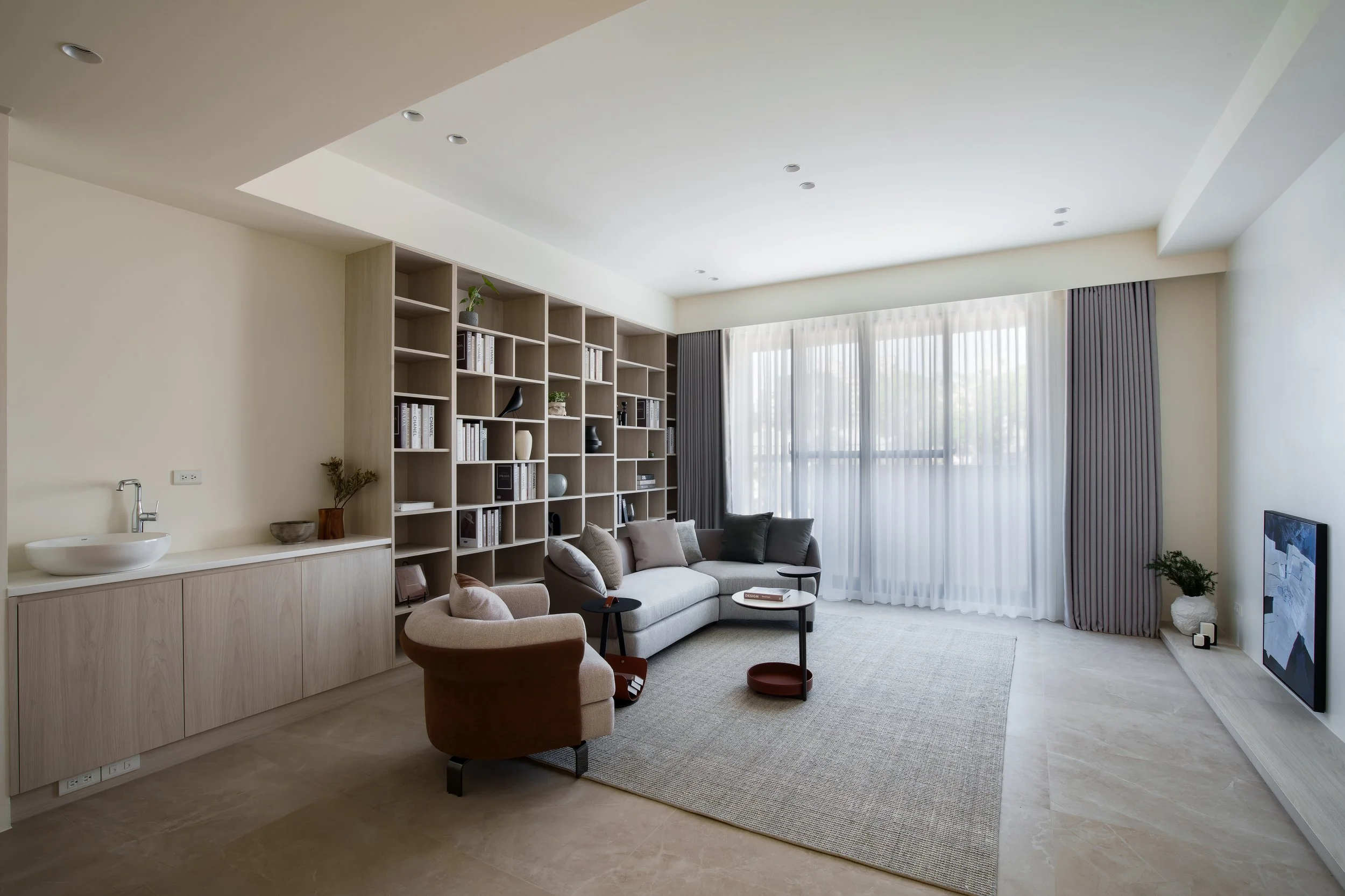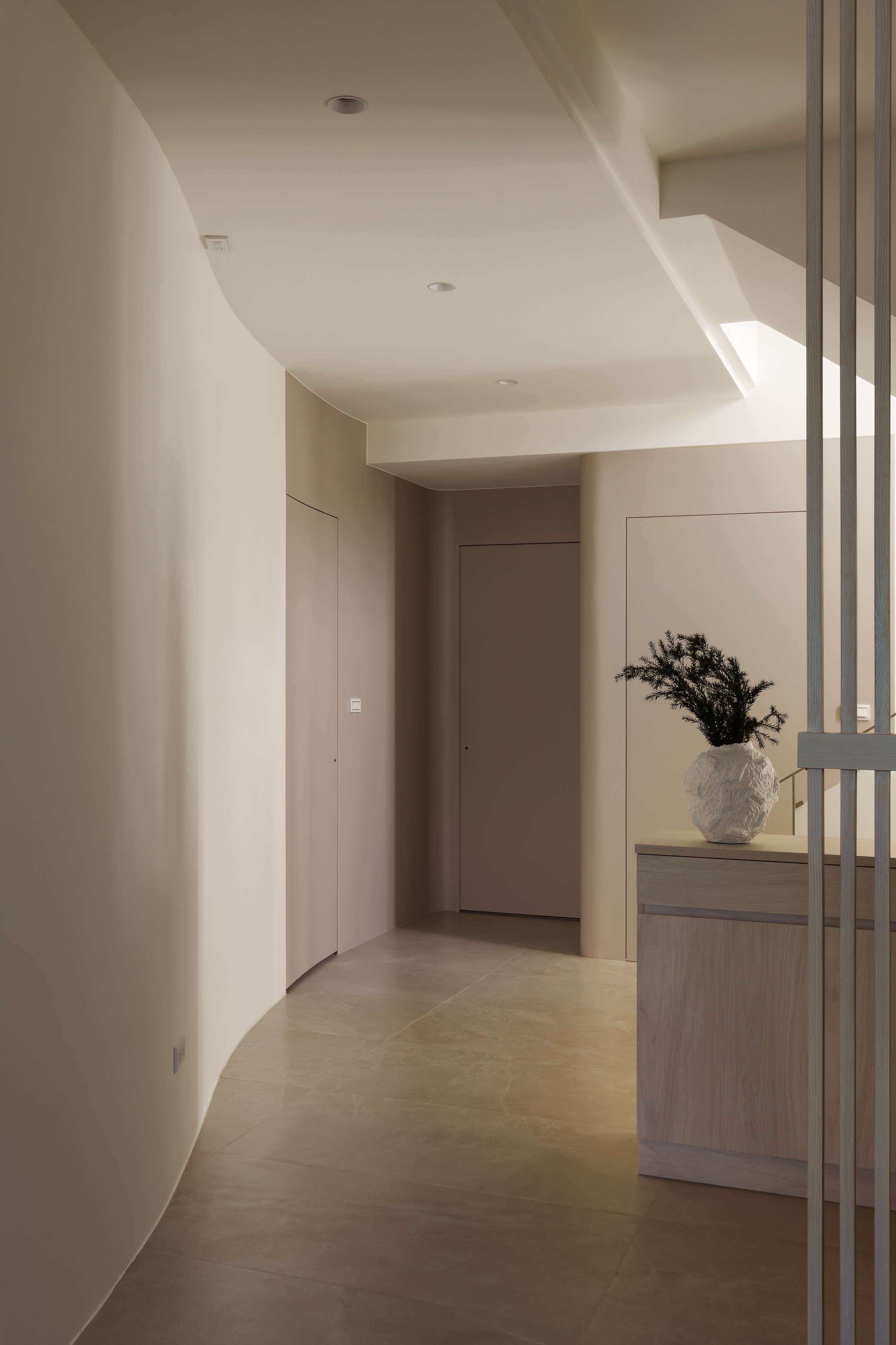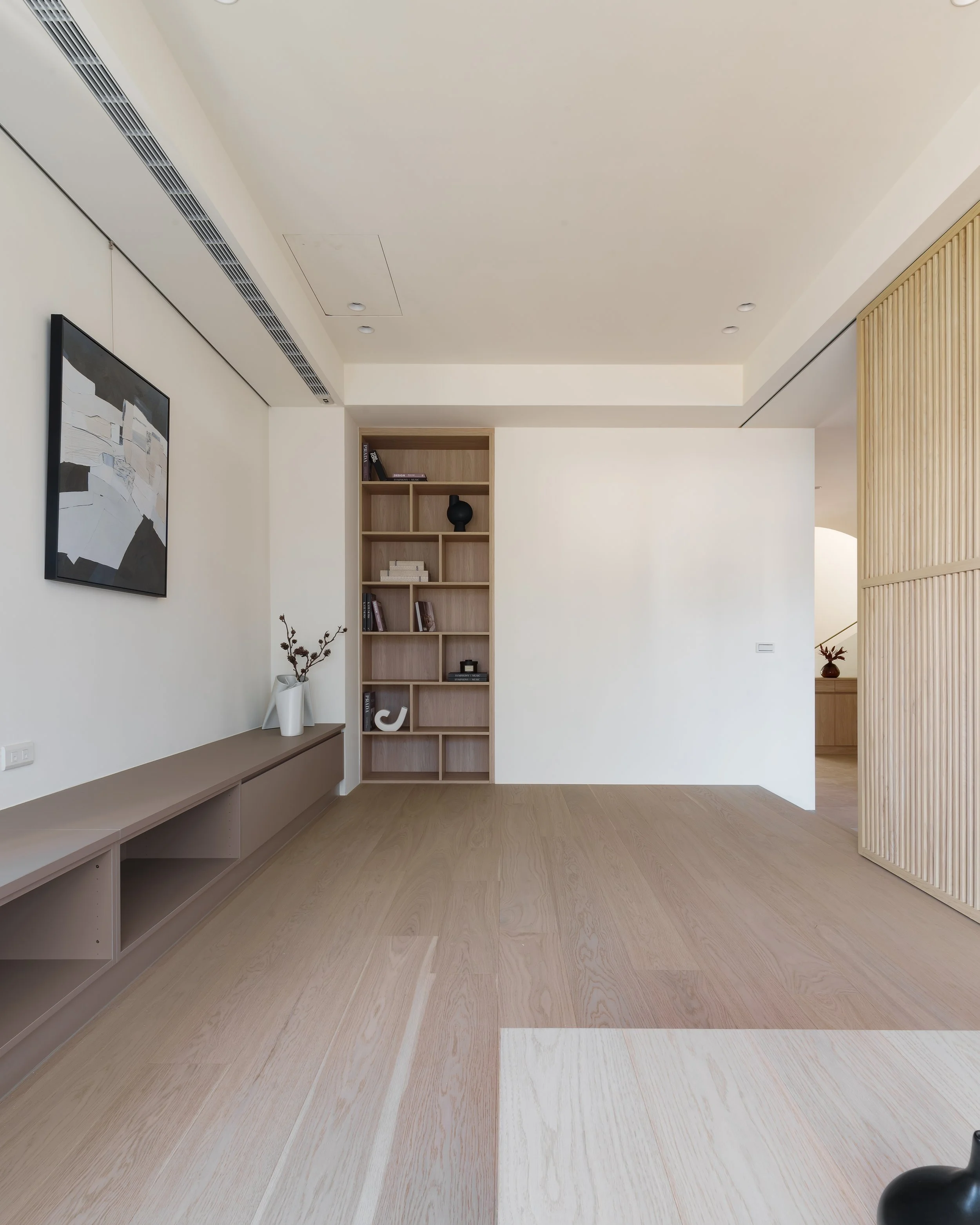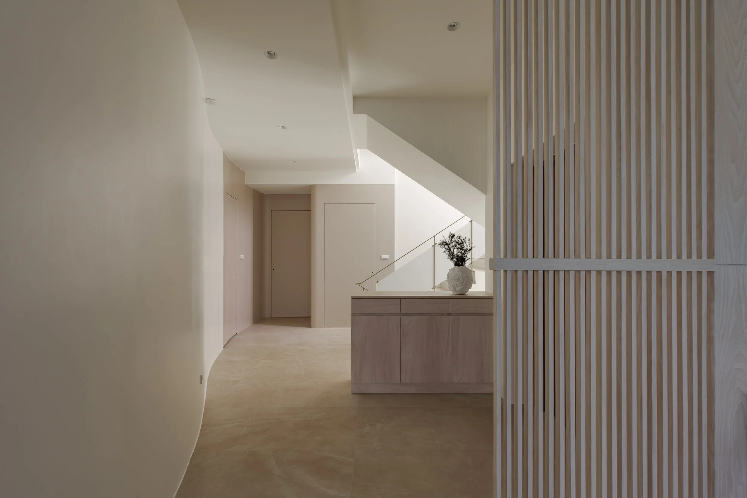透天厝的規劃案,以淺色調為主軸,創造輕盈且無壓的空間感。梯間的圓弧造型牆面,柔化了剛硬的線條,引導視覺動線的流暢。我們善用格柵元素作為空間的過渡與端景,其垂直線條不僅延伸了視覺,更在保有穿透性的同時,巧妙界定出各個機能區域。公共空間多採用開放式櫃體設計,讓居家風格藉由屋主的生活擺飾與收藏,自然地呈現在每個角落。