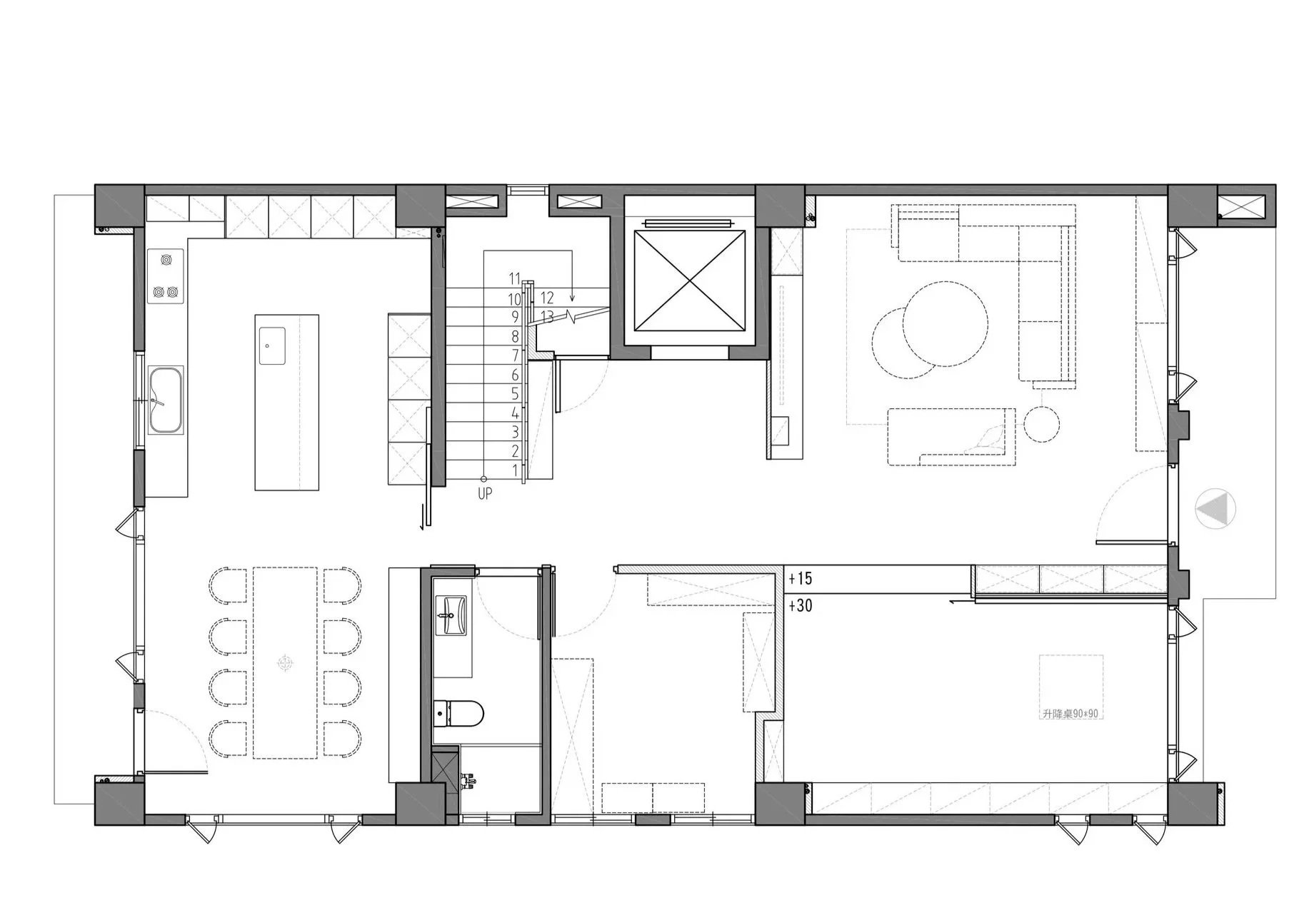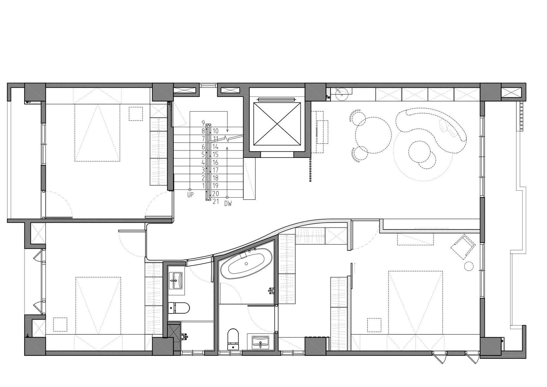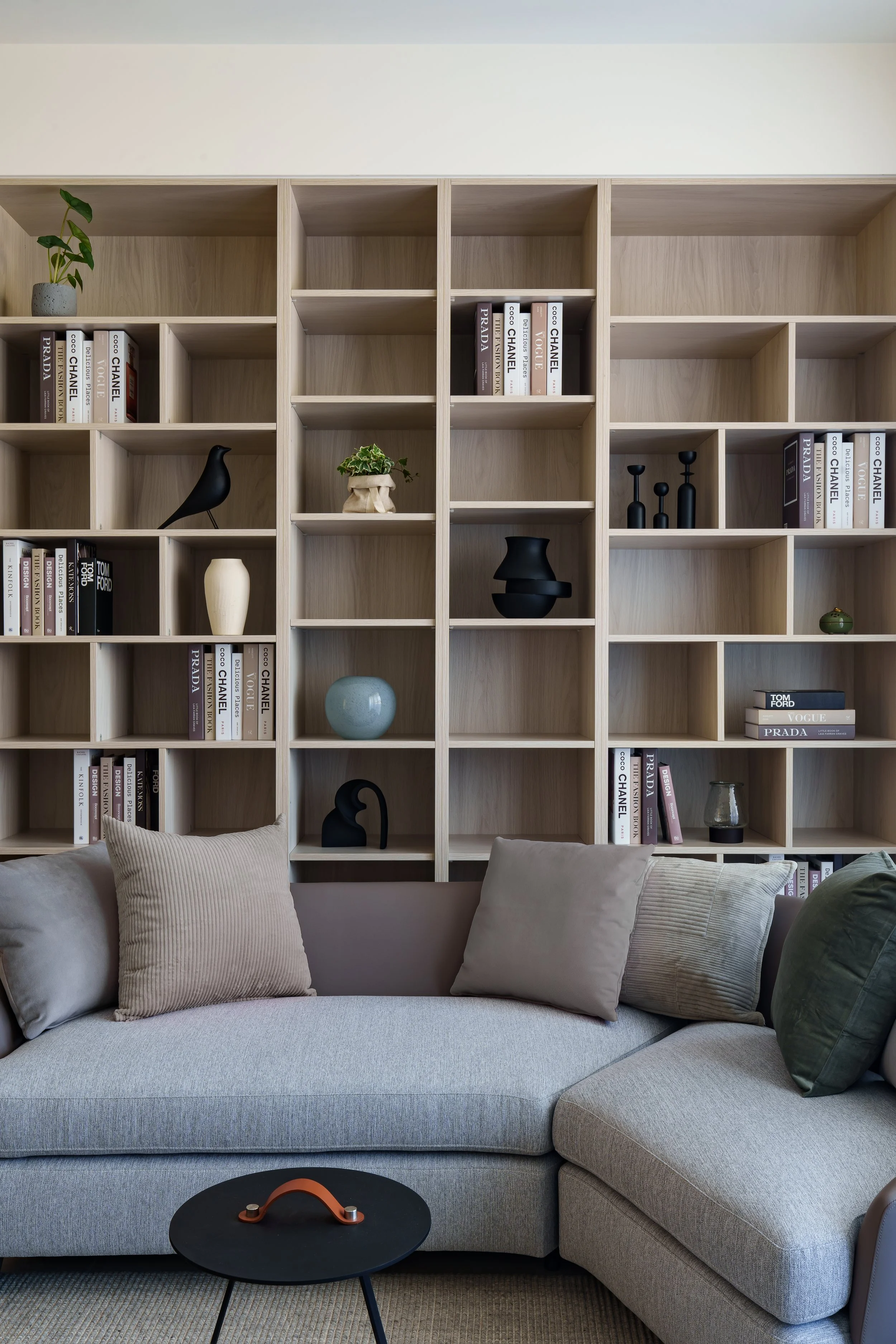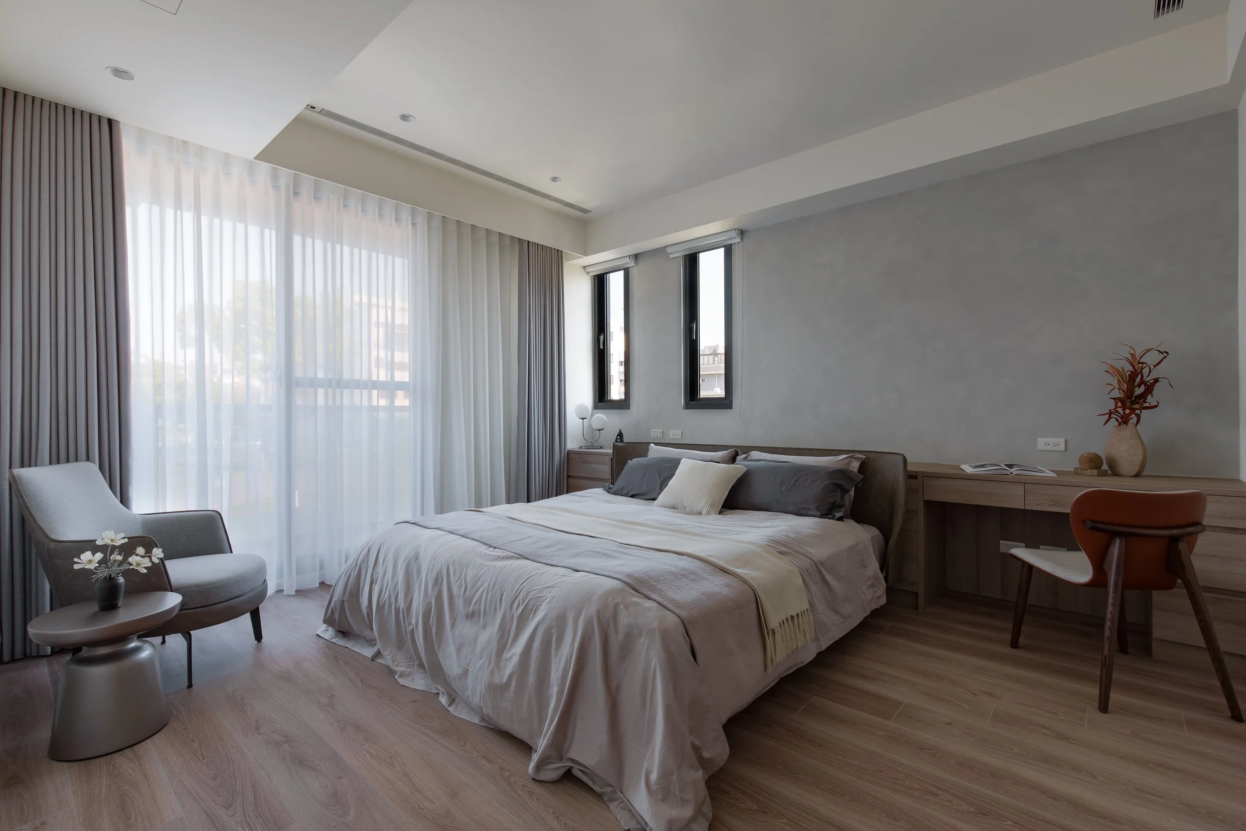 透天厝的規劃案,以淺色調為主軸,創造輕盈且無壓的空間感。梯間的圓弧造型牆面,柔化了剛硬的線條,引導視覺動線的流暢。我們善用格柵元素作為空間的過渡與端景,其垂直線條不僅延伸了視覺,更在保有穿透性的同時,巧妙界定出各個機能區域。公共空間多採用開放式櫃體設計,讓居家風格藉由屋主的生活擺飾與收藏,自然地呈現在每個角落。